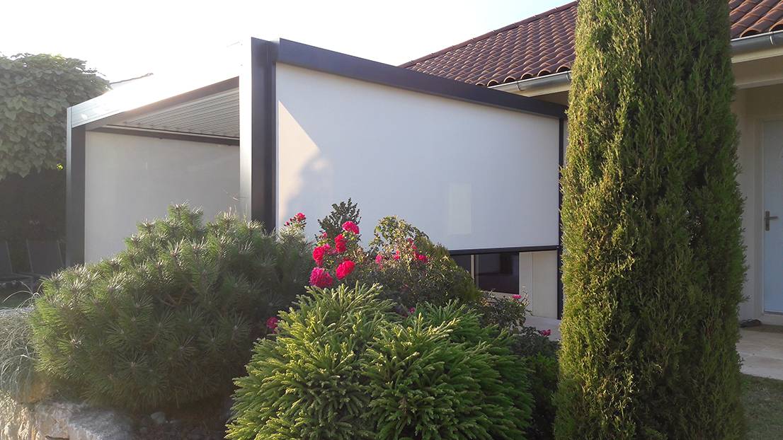 La pergola est ici posée sur une terrasse et accompagnée de stores latéraux afin de se protéger du vent tout en gardant un visuel sur leur piscine.