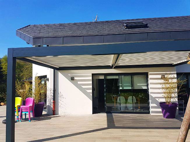 La pergola bioclimatique permet ici de bien gérer la ventilation naturelle sur la terrasse et le rafraîchissement de la maison en été.
