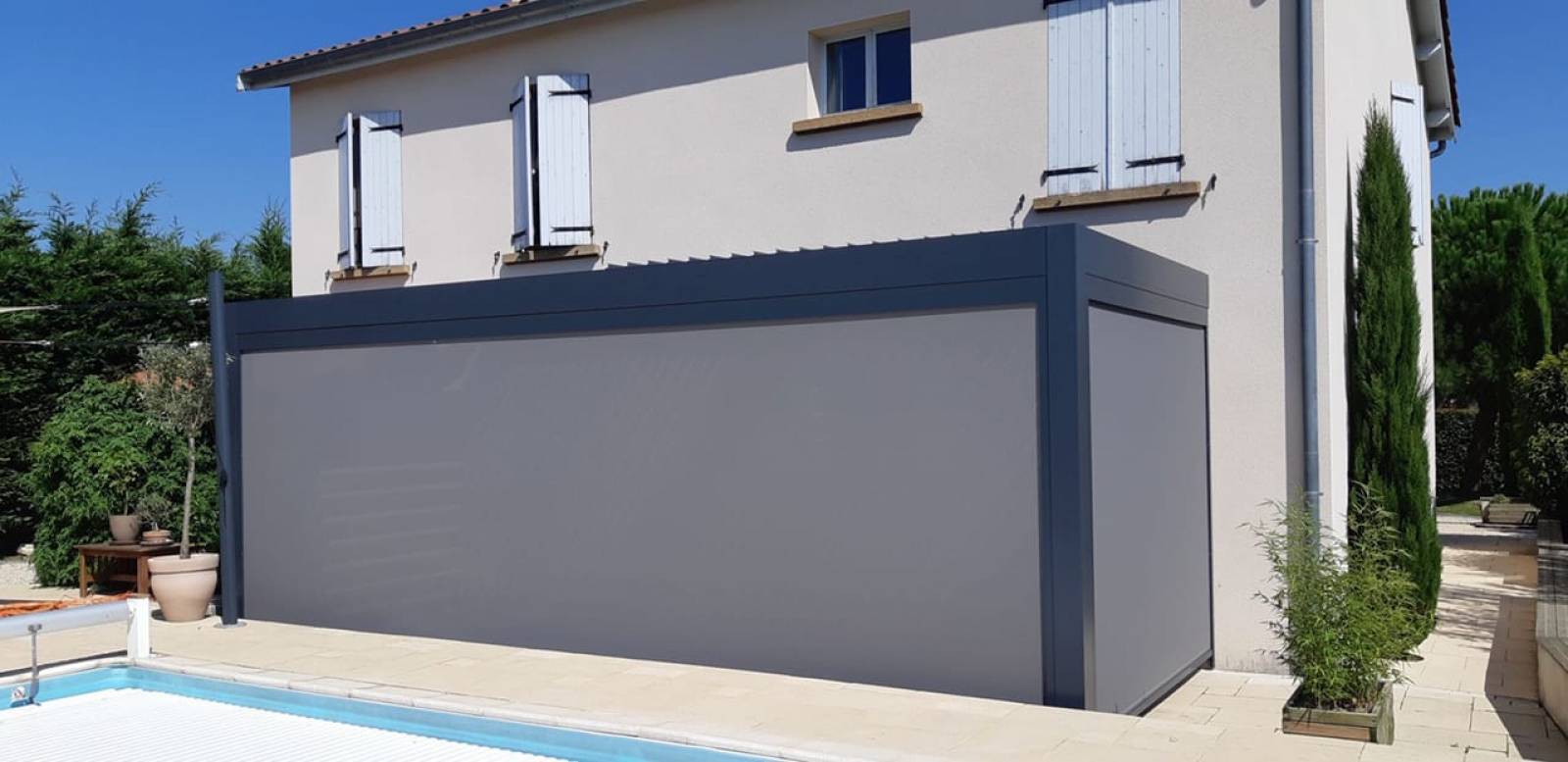 Pergola bioclimatique au bord de la piscine à Saint Jean de Touslas